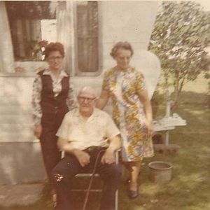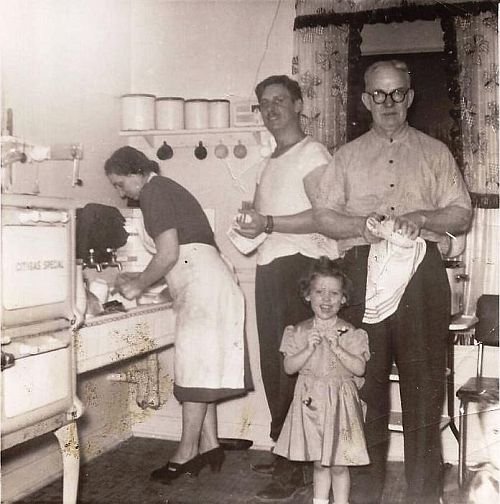 Grandma Northrup at sink Alton Buck then Grandpa Northrup and Jacque