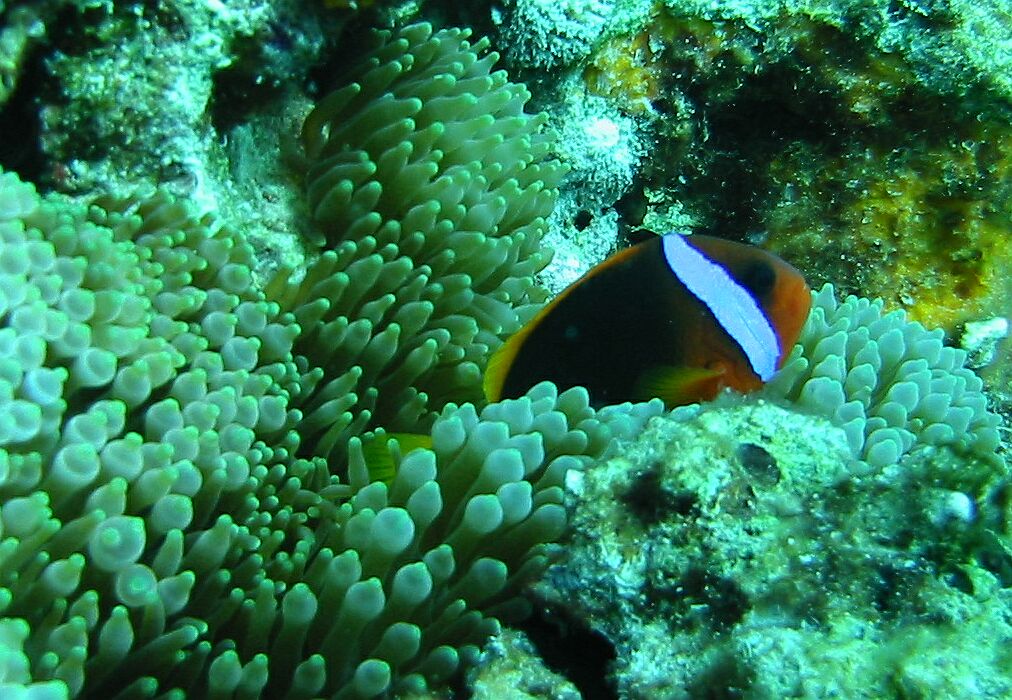 "Clown anemone fish are impish, little orange fish which have evoved a clear survival technique. They live right in amoong stinging tentacles of sea anemones.