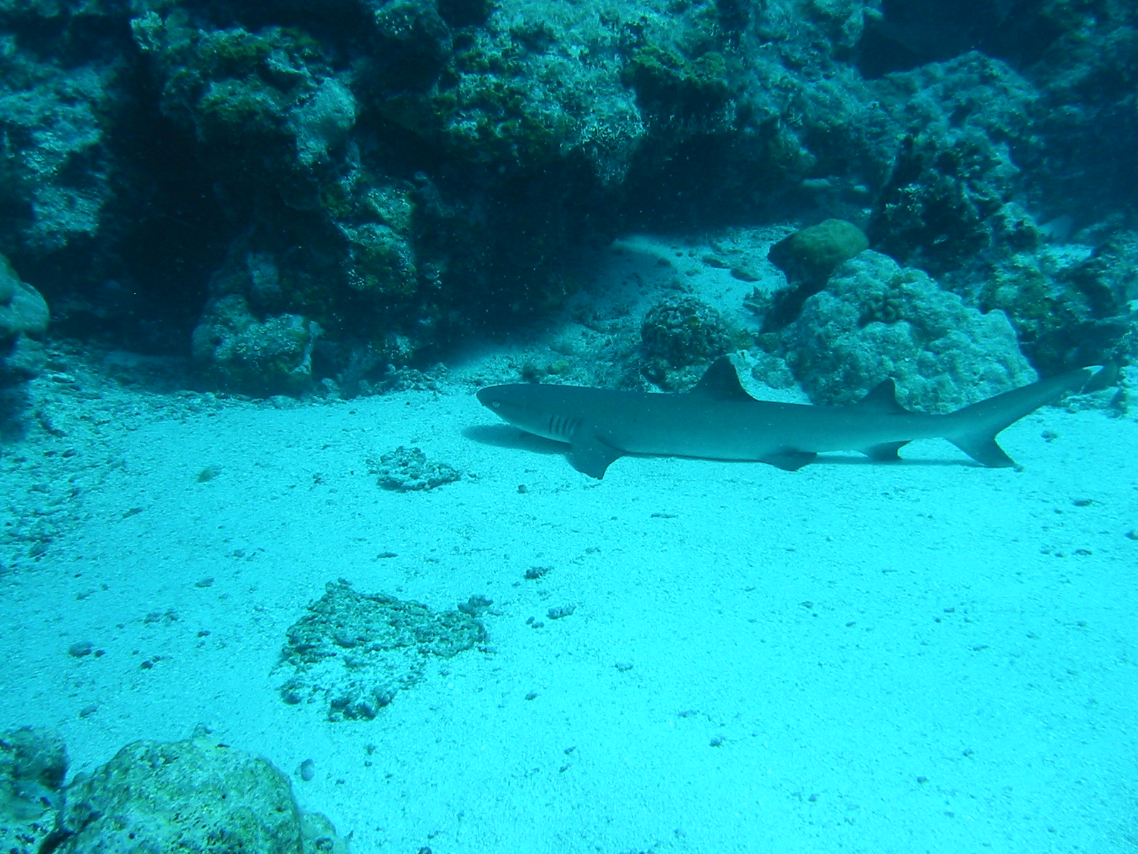 Silvertip shark, Palau, diving site: Blue Corner; Jerry got as close to the shark as possible in order to take this picture.