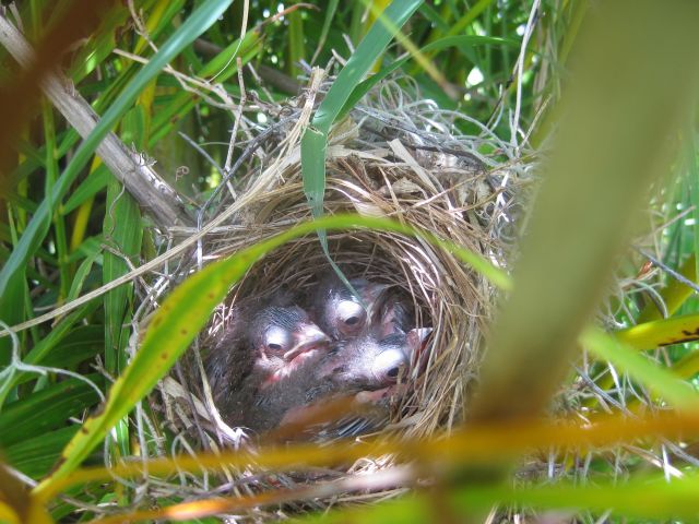 The red bird could be a Hepatic Tanager, which made a home for her hatchlings in our eureka palm which are located in our back yard bush. The hatchlings were there for approximately one week after coming out of their shells.